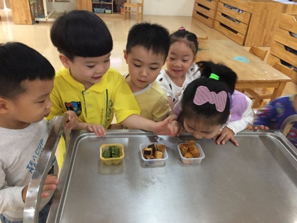 ”孩子吗?你们吃的是什么?你们知道吗?还有今天是什么节日呢?” “是月饼~~~~中秋节~~~~” 今天呀,老师就来给你们说说中秋节吃月饼的故事~~~ 哇,原来就一块小小的点心还有故事呐,真有趣! “孩子们,你们想做月饼吗?” “想!”