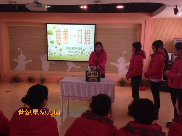 世纪星幼儿园开展“慈善一日捐”活动 发布人:能靓 发布时间:2014/12/17 9:49:05 为贯彻落实党的十八届四中全会及国务院常务会议关于发展慈善事业的精神,充分发挥慈善救助在社会救助体系中的补充作用,近日世纪星幼儿园组织全园教师开展了“慈善一日捐”活动。 按照上级部门关于“慈善”工作的通知精神,在园领导和工会主席的带领下,教师们了解了“一日捐”的重要意义,并积极响应,伸出友爱之手,慷慨解囊,捐款数额不等,少则几十元,多则上百元,捐款有限,爱心无价,表达了老师们 支持慈善事业的一片心意。(信息员:尤晓敏)