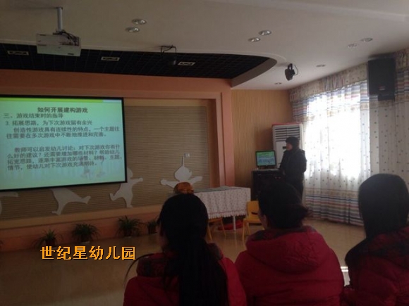 世纪星幼儿园开展“建构游戏实践经验分享交流”活动 发布人:能靓 发布时间:2014/12/17 12:35:04 为进一步深入探讨建构游戏的组织与指导,提升教师的建构游戏经验,增进互相交流与学习,近日世纪星幼儿园特邀请姐妹园老师来我园进行了主题为“幼儿园情境式建构游戏实践经验”的交流与分享。 来自建邺实验幼儿园的教研组长王老师以PPT的形式从建构游戏的目的、技能、常规、创造、表达及材料的提供层次等方面分析了幼儿园目前存在的问题,同时也从教师指导、评价、主题选择、活动准备等方面进行了总结与反思。这次交流分享活动,给教师提供了一次互相交流、学习的机会,也为我园的课题研究提供了良好平台,这将促使建构游戏活动今后在我园更好地落实、开展!(信息员:尤晓敏)