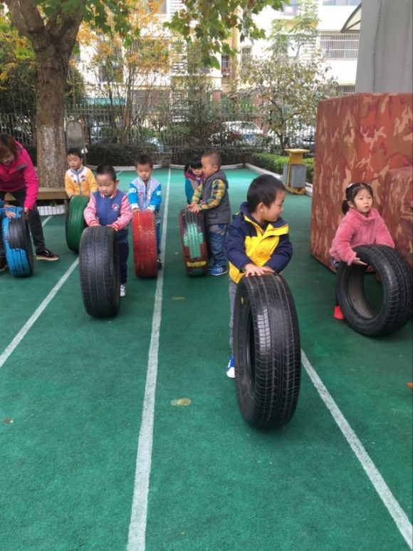 每个小男孩都对汽车充满了幻想,每个小男孩都对汽车的轮胎充满好奇。它们是怎么滚动的呢?在幼儿园里我们就一起来滚滚轮胎吧。快,扶好了,往前推,一点点前进,到达终点了,AZA!