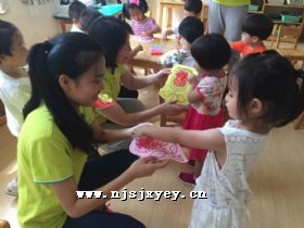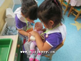 宝贝们已经很好地适应了幼儿园的生活,有趣的集体活动还有好玩的区域游戏,瞧,热闹的区域游戏开始了,娃娃家的宝贝们在照顾小宝宝们,大家还会给娃娃们冲奶粉呢,还有果蔬店的孩子们正在认真地加工蔬菜,幼儿园里真开心!
